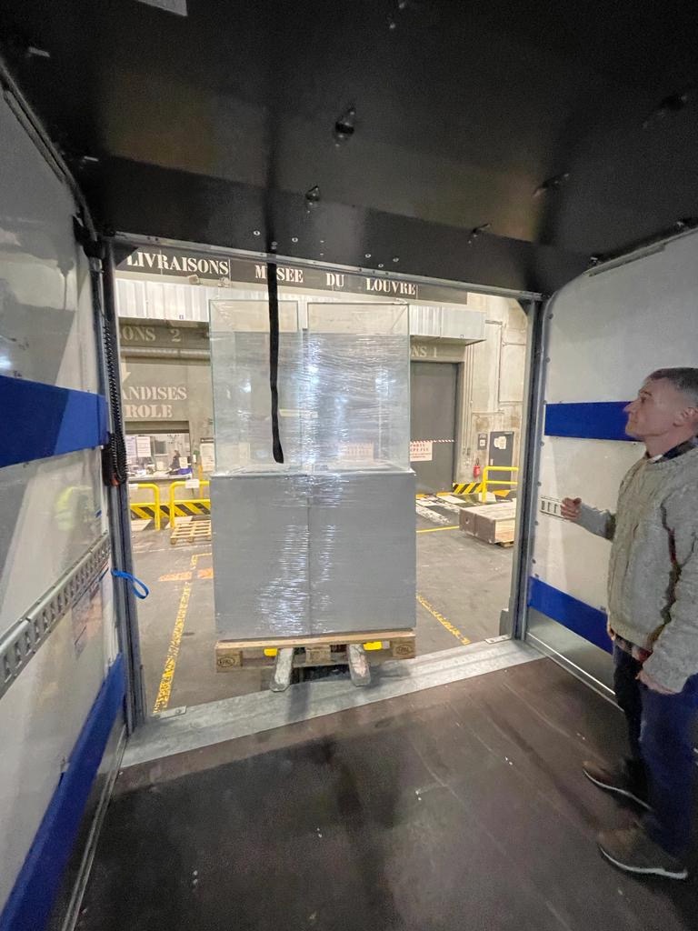 Le musée du Louvre nous ayant fait le don de 9 vitrines, il nous a fallu assurer leur transport du Musée du Louvre à Paris jusqu’à Saint-Lupicin, site de notre futur musée, soit environ 500km de distance entre ces deux localités.
