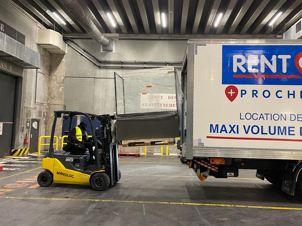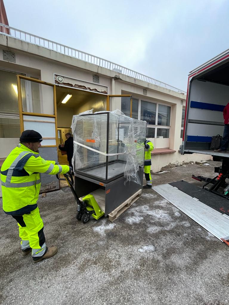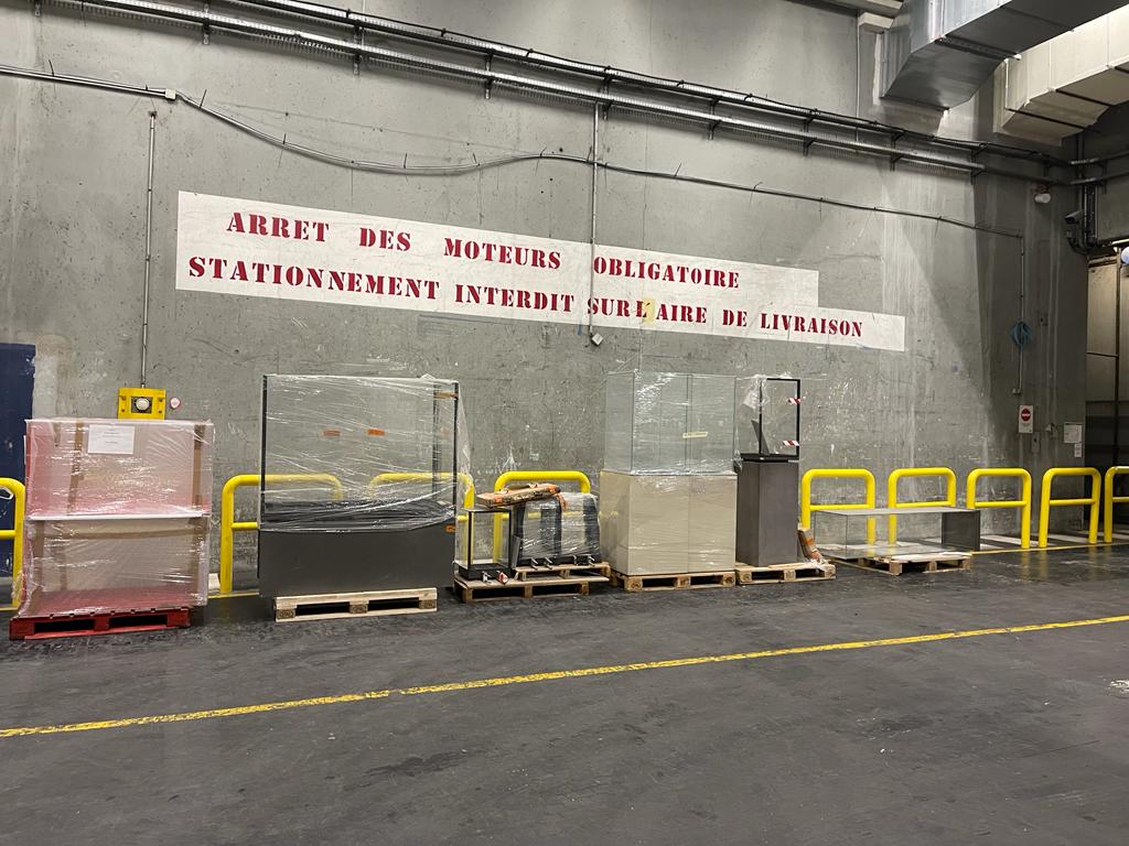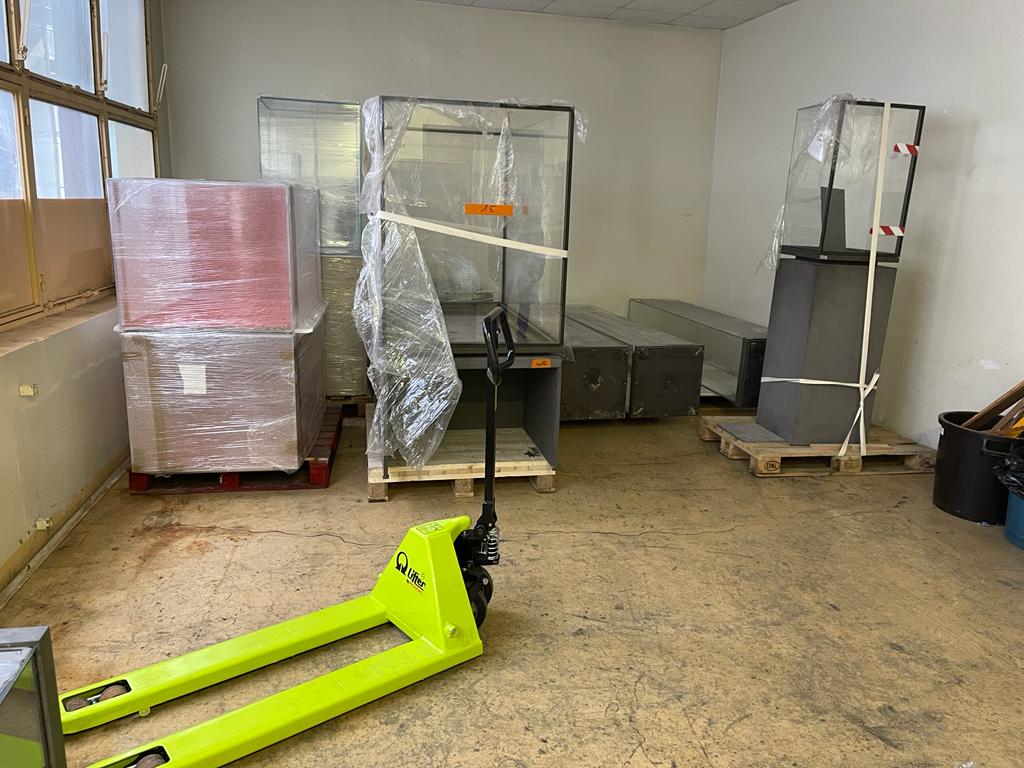 Après 1h30 dedéchargement, toutes les vitrines sont entreposées dans les locaux du futur musée